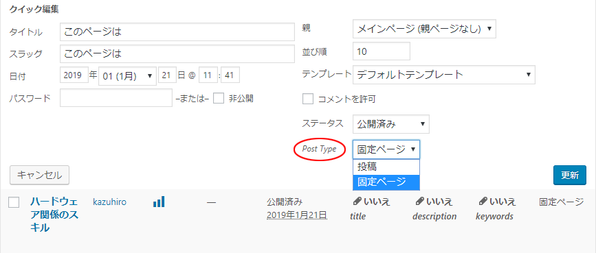 目的の固定ページの、クイック編集をクリックすると、PostType という項目が出来ています。
