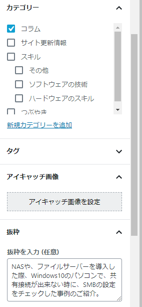 このように、カテゴリーを適切なものにチェックを入れ、抜粋も書き加えて保存します。
