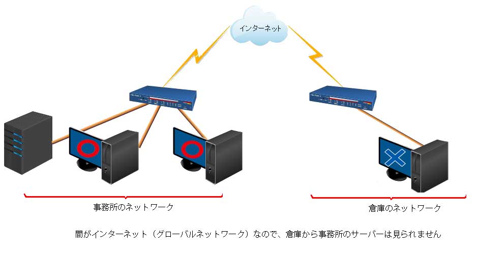 上の図の事務所と倉庫は、それぞれ別のローカルネットワークですから、互いにデータをやりとりする事はできません。