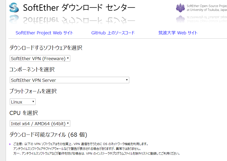 サーバーがLinuxなので、コンポーネントをVPN Server、プラットフォームはLinux、CPUはx64にしてダウンロードします。
