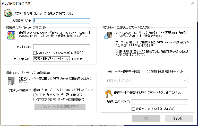 新しい接続設定で、VPN Serverをインストールしたサーバー機への接続を作成します。