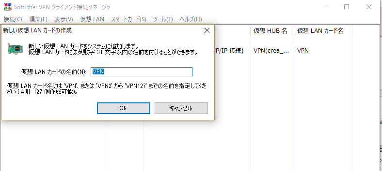 仮想LANカードの追加から、VPNという名前の仮想LANカードを追加しました。
