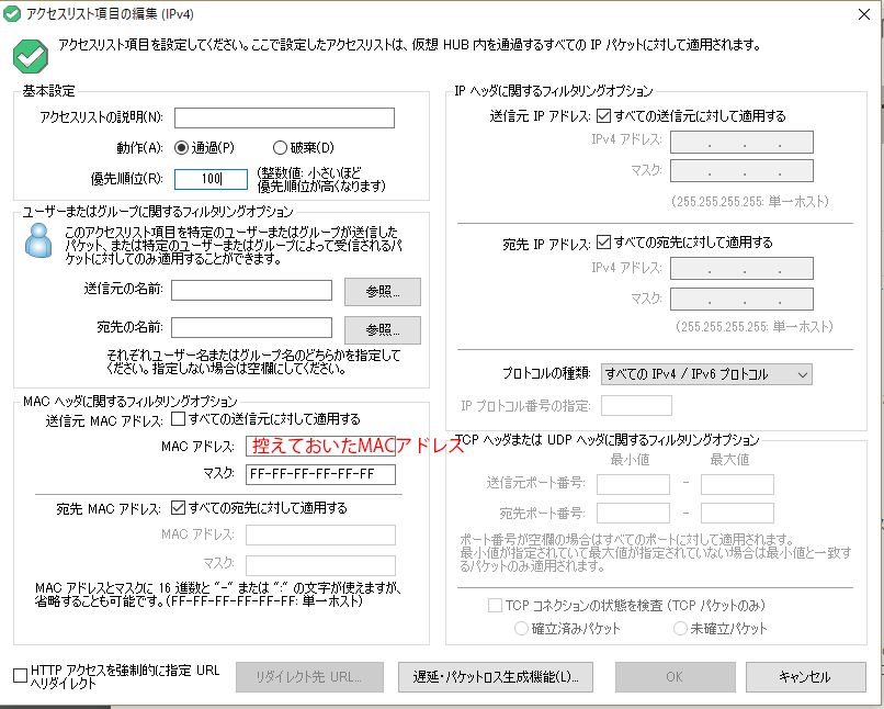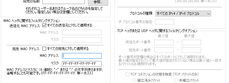 先ほどと似ていますが、今度は宛先のMACアドレスに、控えておいたMACアドレスを入力し、送信は全てとします。