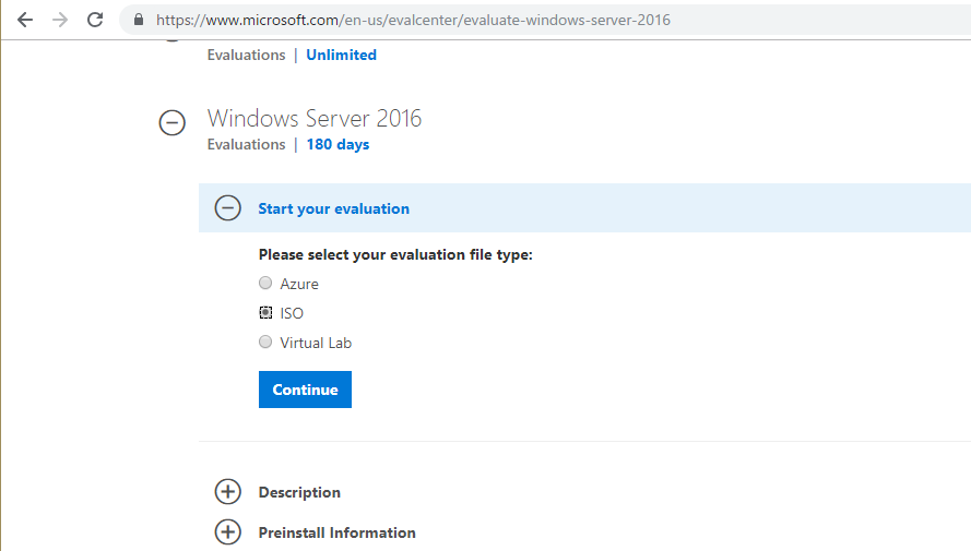 まず、MicrosoftのWindows Server試用版のページに行き、OSのISOファイルを入手します。