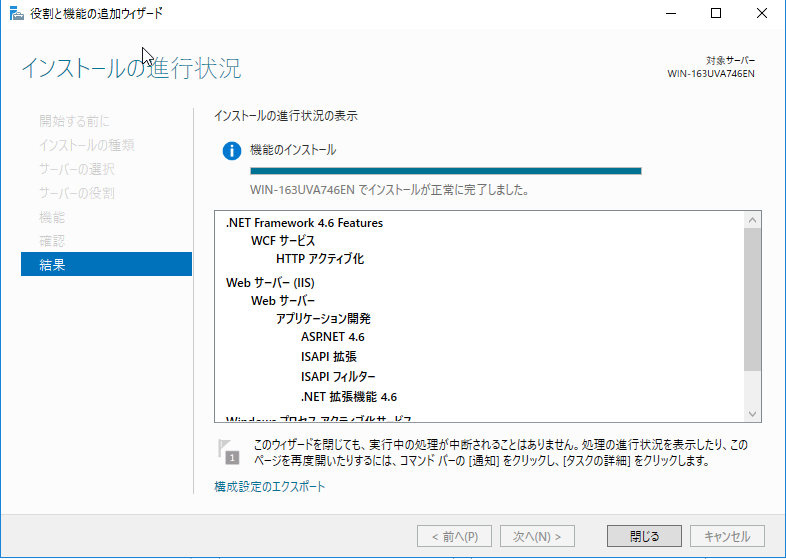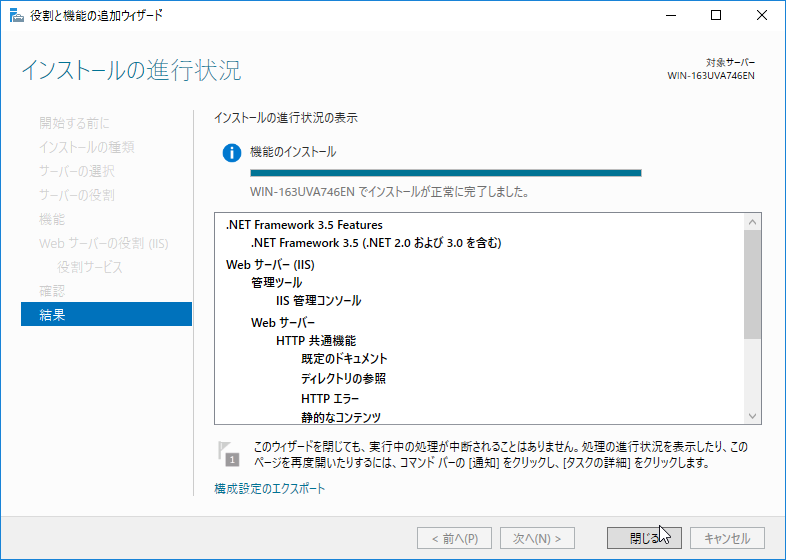 インストールが正常に完了しました が現れたら、これでWEBサーバーの構築は完了です。