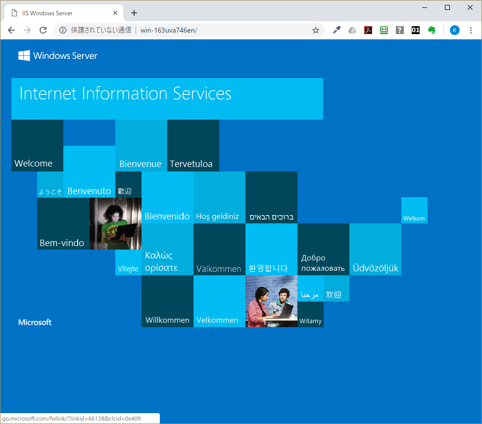 Windows Serverのコンピュータ名をブラウザで呼び出してみると、正常にスタートページが表示されています。