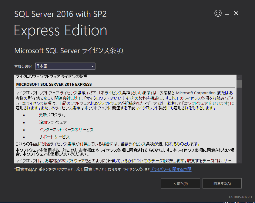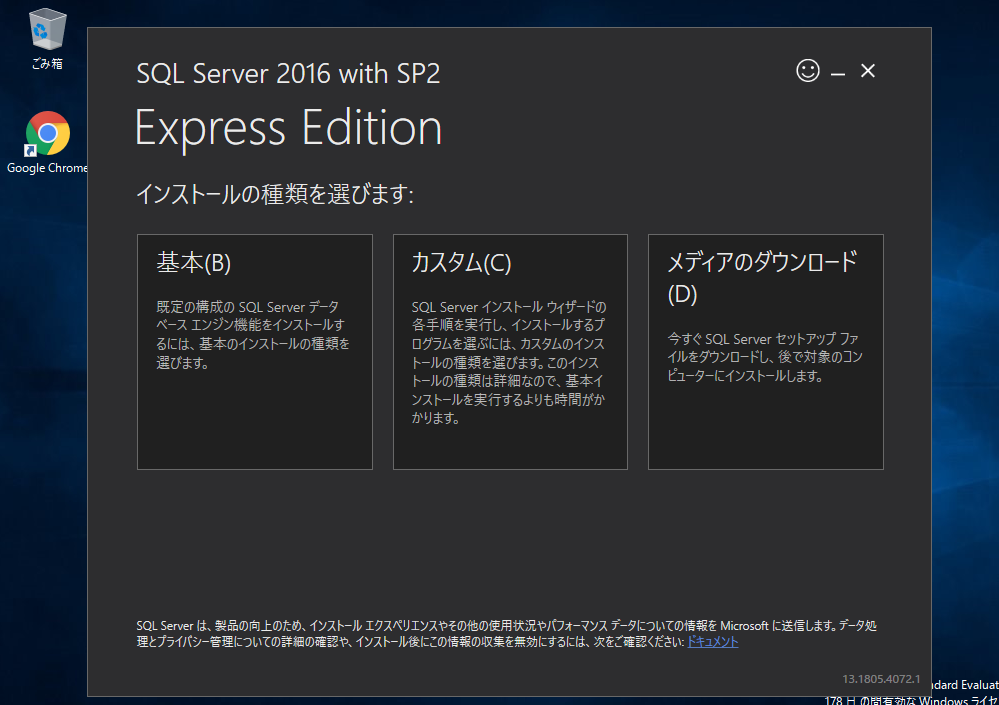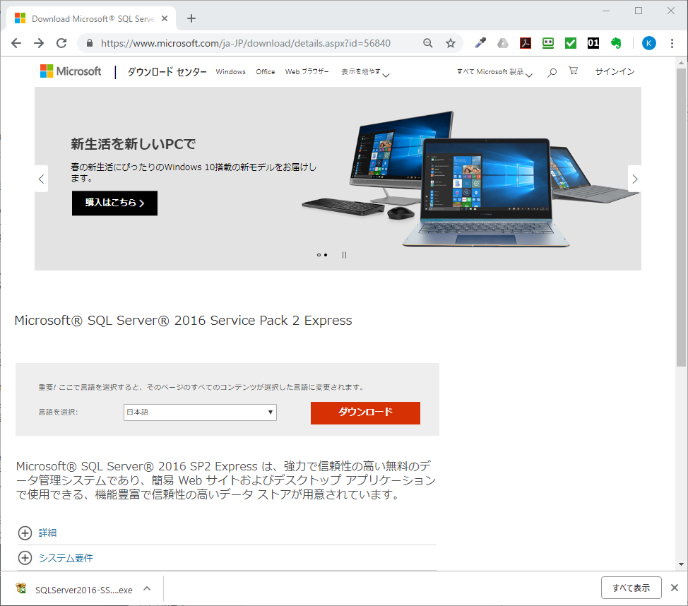 Microsoftのダウンロードセンターで、SQL ServerのExpress(無料版)をダウンロードします。