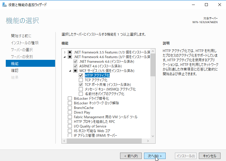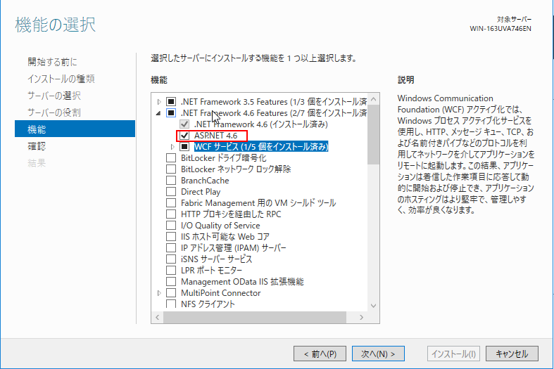 ASP.NETと、HTTPアクティブ化をインストールします。