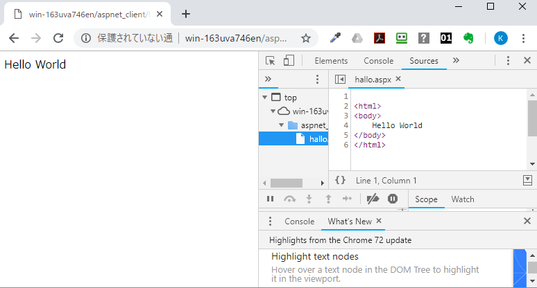 で呼び出すと、HTMLが作成されて表示されますので、ASP.NETは正常に動作しています。