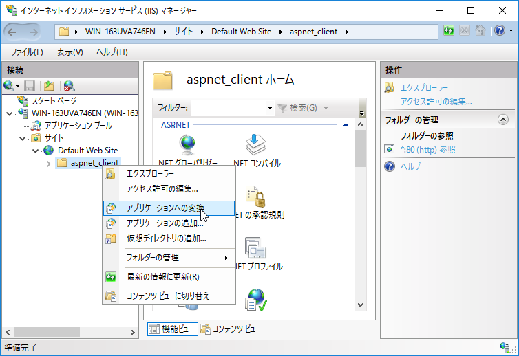 順番にツリーをクリックしていき、 aspnet_client で右クリックして、「アプリケーションへの変換」を行います。