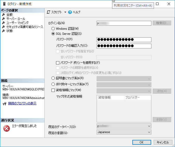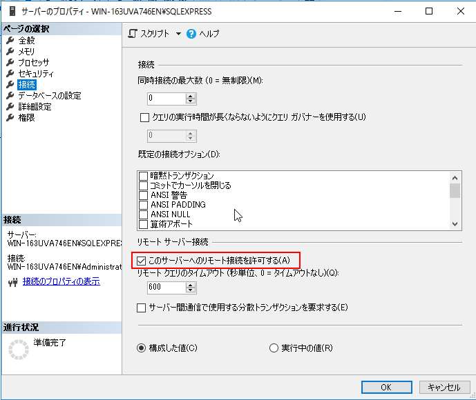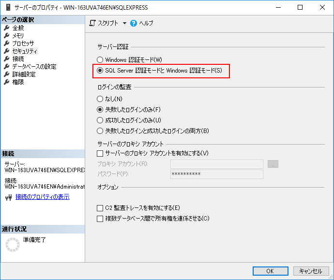 SQLServerはインストール時に特に指定しなければ、Windows認証のみで接続するよう構築されます。
