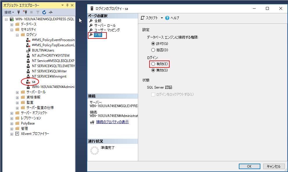 SQLServer の管理ユーザは、sa というユーザーになりますが、混合モードにしてもsaは無効なままです。