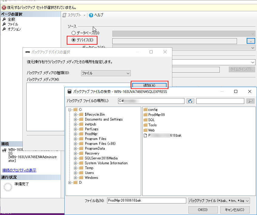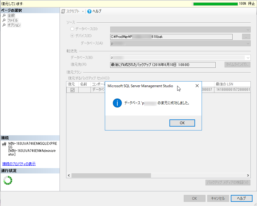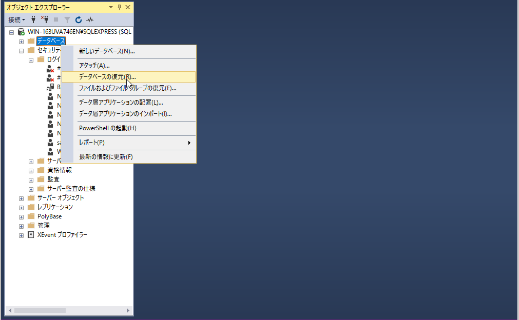 別のSQLServerでバックアップされたファイルを適用すると、簡単にデータベースを復元できます。