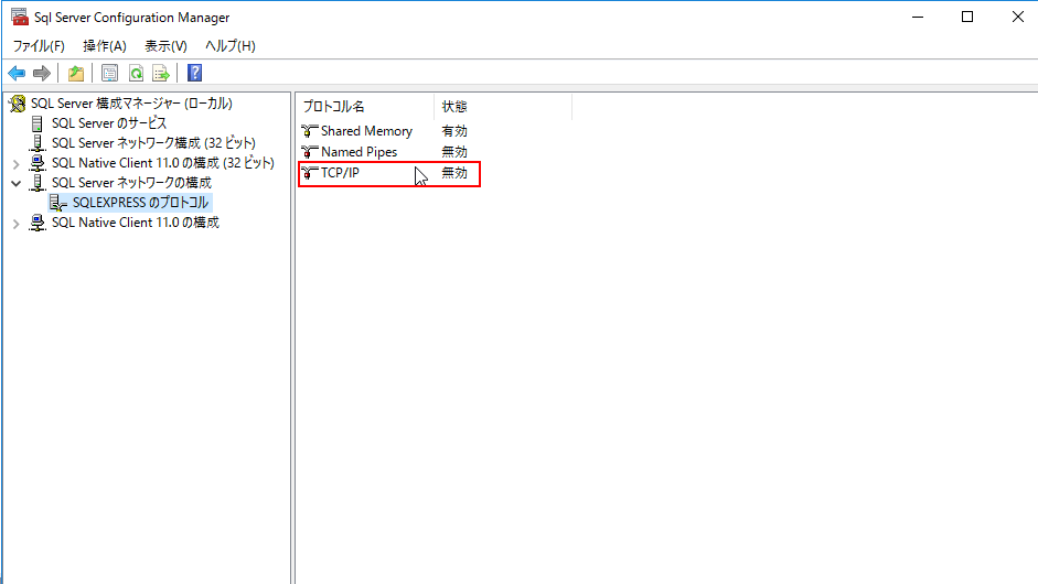 デフォルトの設定では、TCP/IPが無効になっているので、右クリックし、有効化を選んで、有効にします。