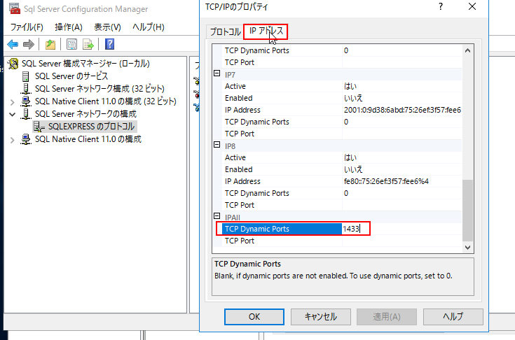 このため、もう一度、TCP/IPを右クリックしてプロパティを出し、IPアドレスのタブで、TCP Dynamic Portsを1433にします。