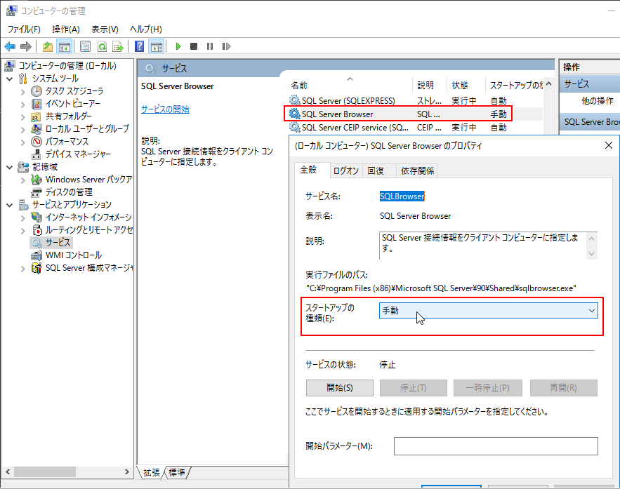 次に、SQL Server Browserもデフォルトでは起動していないので、コンピュータの管理から、サービスを開き、 SQL Server Browser を探して右クリックでプロパティを開き、起動時に開始されるよう、スタートアップを自動にしておきます。