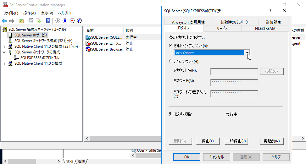 また、SQLServer自体も、ビルトインアカウントに設定し、Local Systemにしておきます。