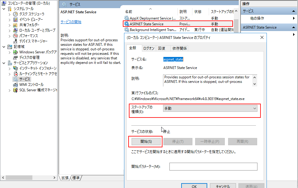 コンピューターの管理からサービスを開き、aspnet_stateを探して右クリックして、スタートアップを自動にし、サービスの状態で開始をクリックしてスタートさせます。