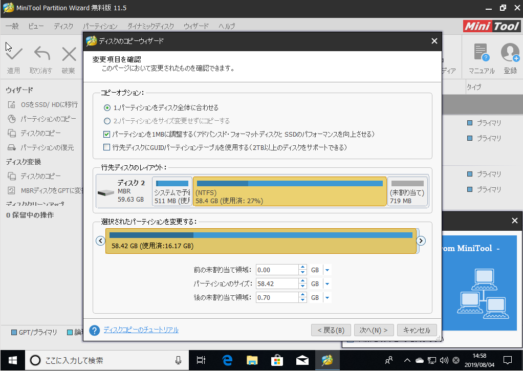 そうして、パーティションのサイズをコピー開始前に直接操作できるというのも親切ですね。