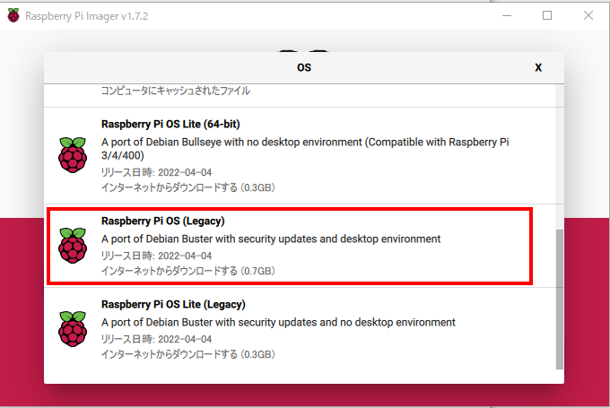 上記のインストールの際、OSの選択として、Raspberry Pi OS(Legacy)を選択します。