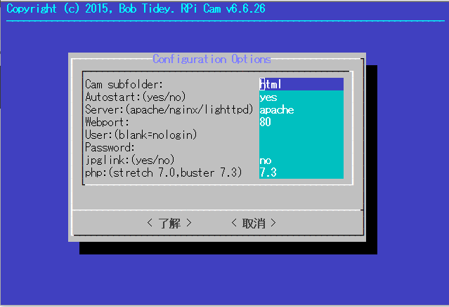 また、外部からカメラ画像を見るため、WEBサーバーのApacheがインストールされます。