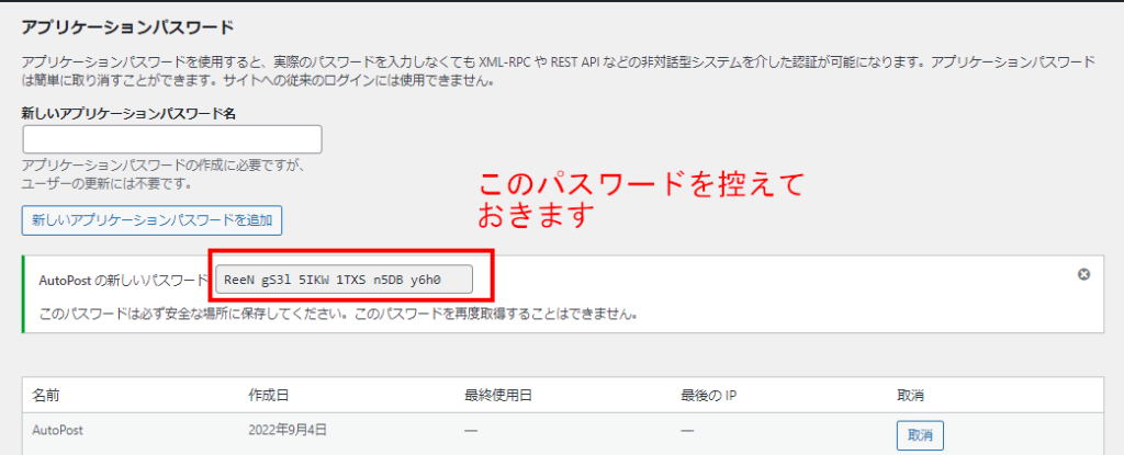スクロールで下に下がると、アプリケーションパスワードという項目があるので、適当な名前を付け、アプリケーションパスワード追加ボタンを押下します。