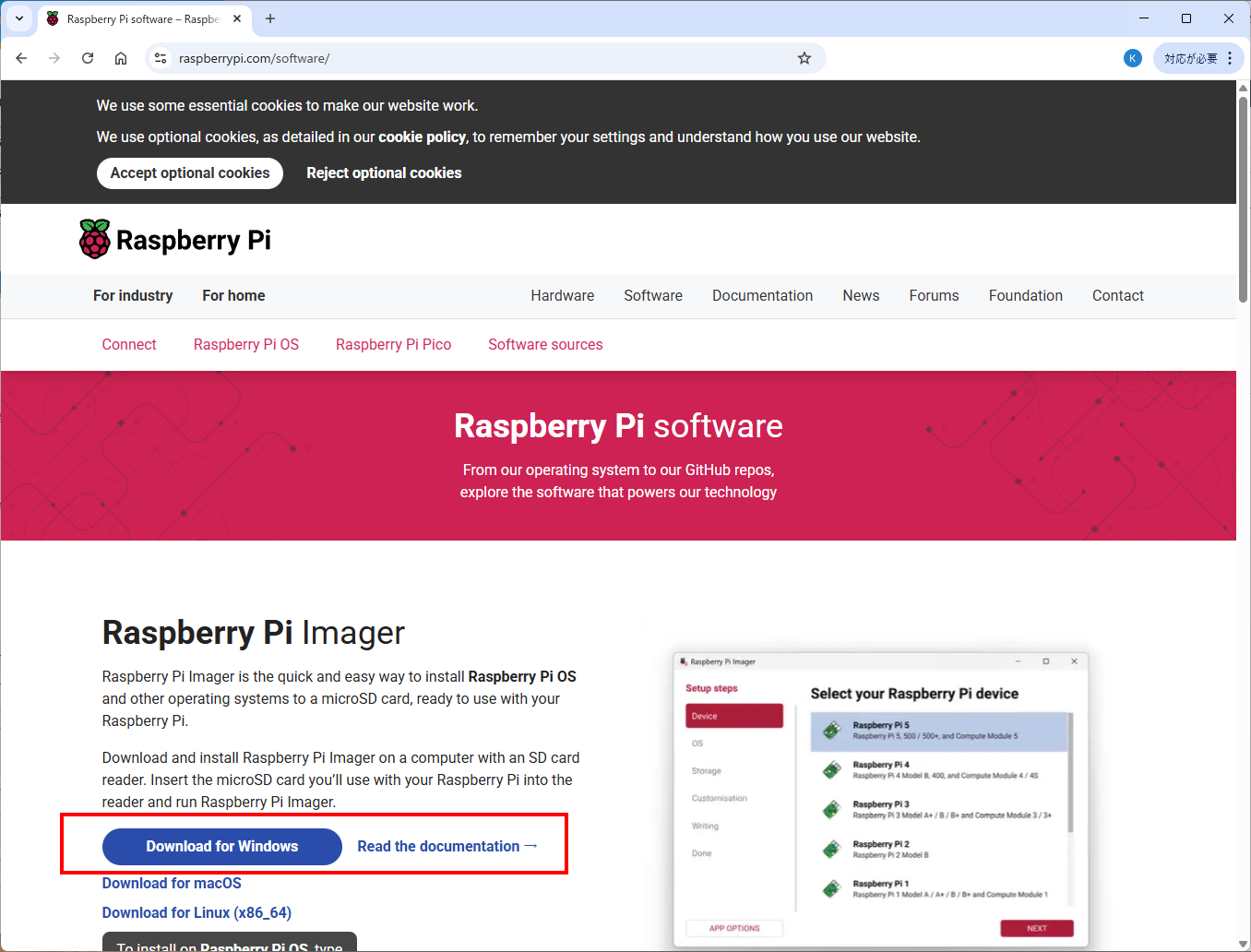 Raspberry Piの本家サイトに行き、ご自身が使っているパソコンのOSに合わせたインストーラーを選択してください。