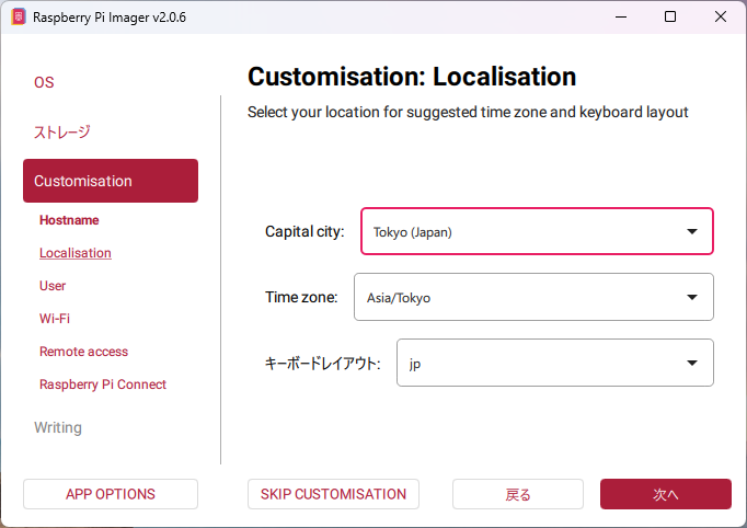 city、 Time zoneはTokyo、キーボードレイアウトはjpを選択します。