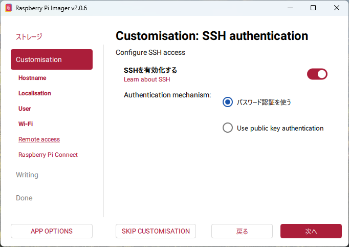 基本的に、Raspberry Piが起動してからキーを作って共有する方が確実なので、ここではパスワード接続にします。