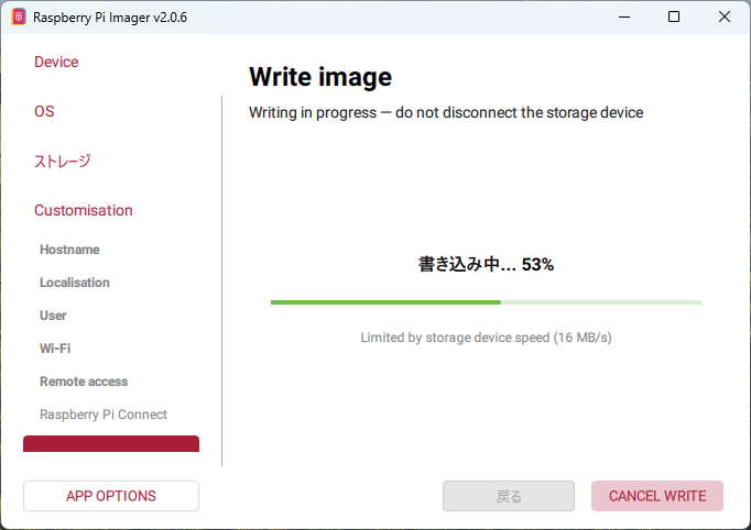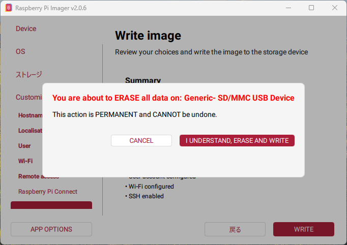 書き込みがはじまれば、指定したストレージのデータは全て消去されます。