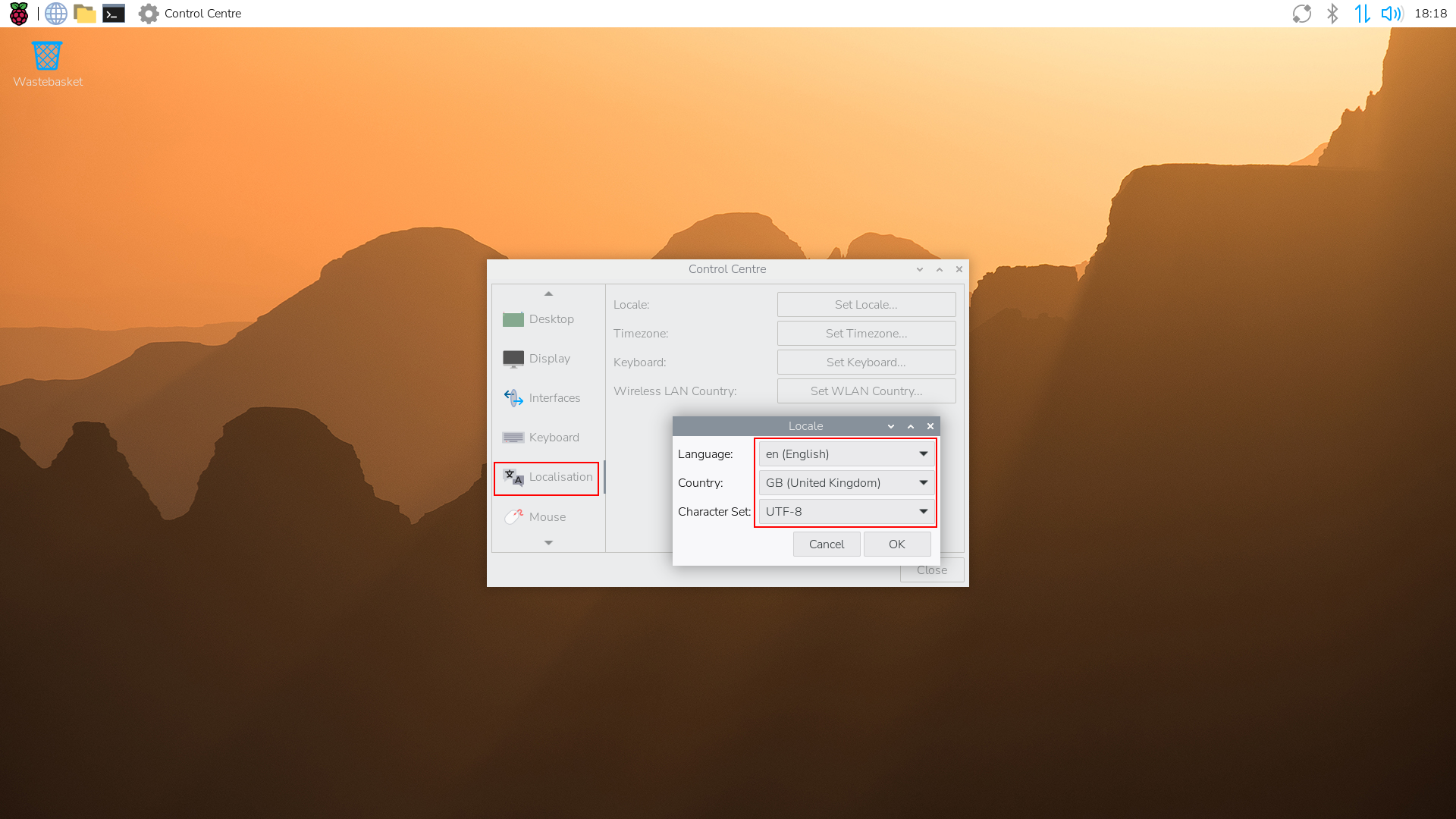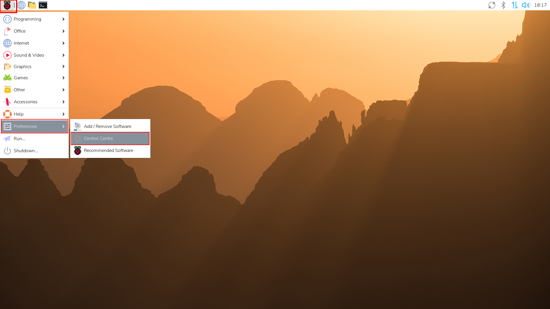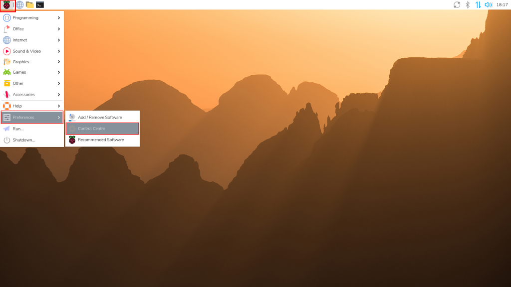 スタート(Raspberryのマーク)、preferences、Control Centerの順にクリックします。