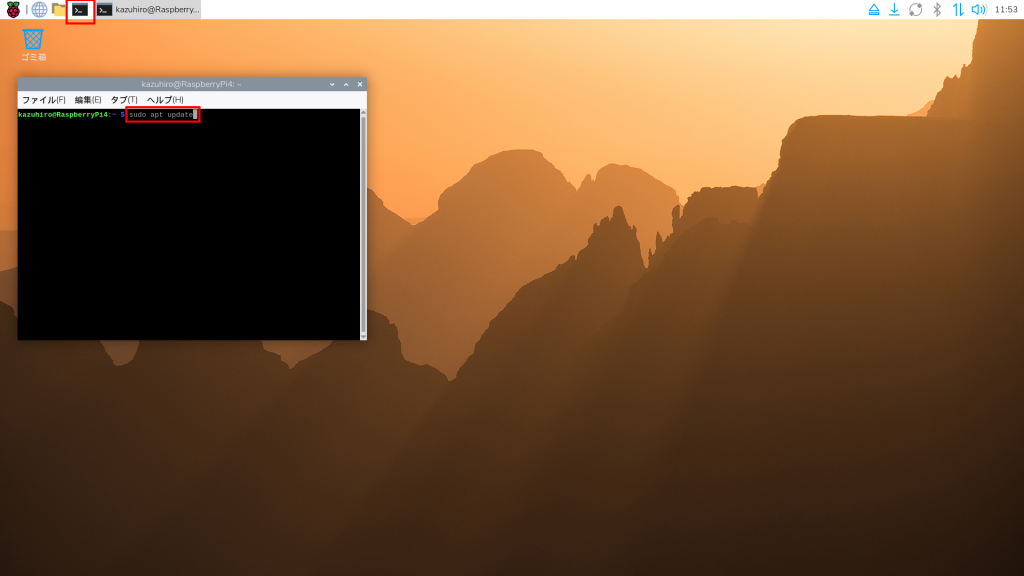 赤枠で囲った黒いアイコンが、ターミナルのアイコンなのでクリックして起動します。