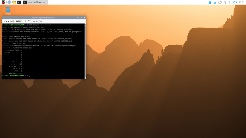 出来上がるキーは、id_ed25519 id_ed25519.pubの二つです。