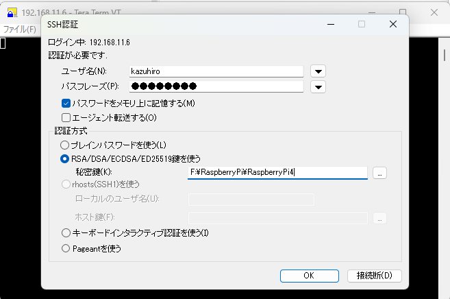 すると、Tera Termの新しい接続で、Raspberry PiのIPを指定し、ユーザー名とパスワードだけを入れてOKを押すと、このように認証に失敗します。