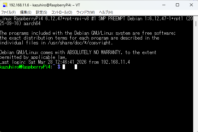 この画面では、Windows11のTera TermからRaspberry Piに接続を試みています。
