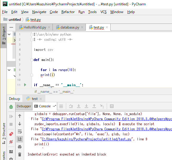 一方、Pythonで同じようにインデント無しをしようとするとエラーになります。