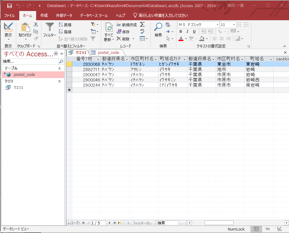 クエリで、町名に「岩崎」が入っているデータを検索すると、東金などいくつかのデータが出ました。