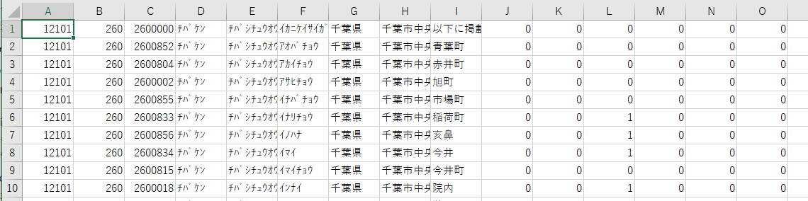 テーブルの各項目については、郵便番号データの説明ページを参照しました。