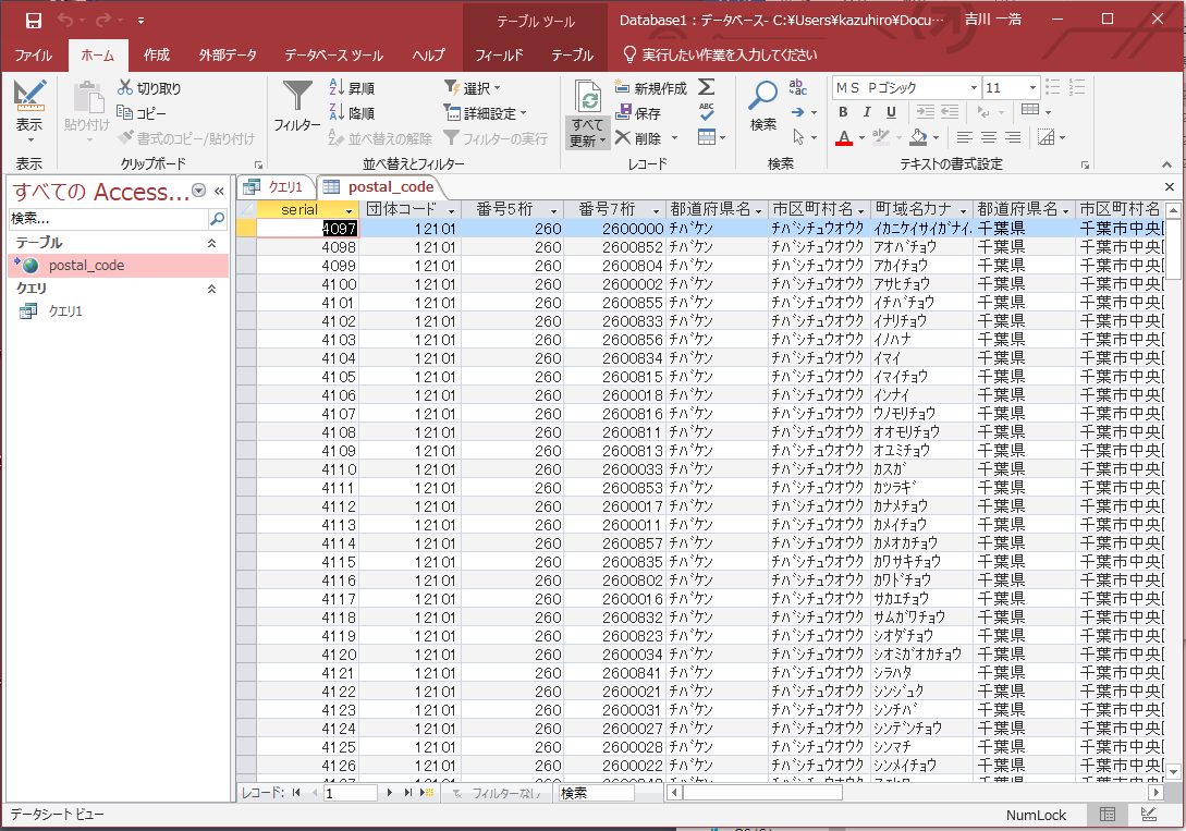 SQLデータベース の記事で作成したデータベースに、郵便番号用のテーブルを用意します。