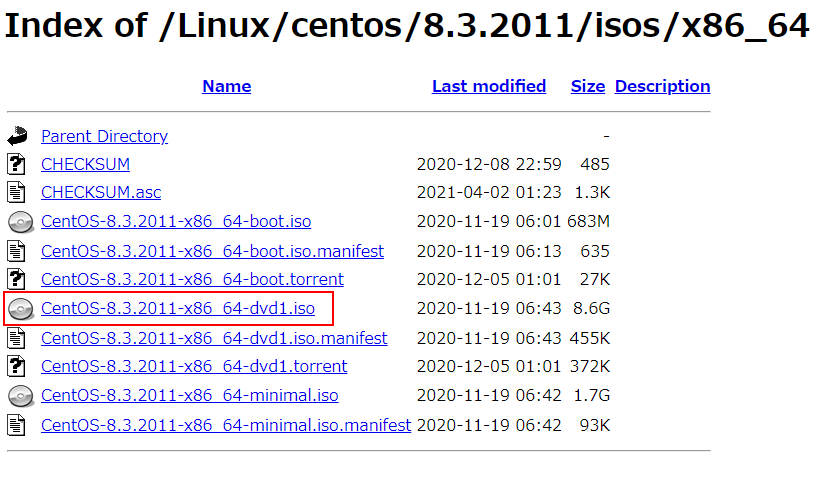 CentOS-8.3.2011-x86_64-dvd1.iso を選択するとダウンロードできます。