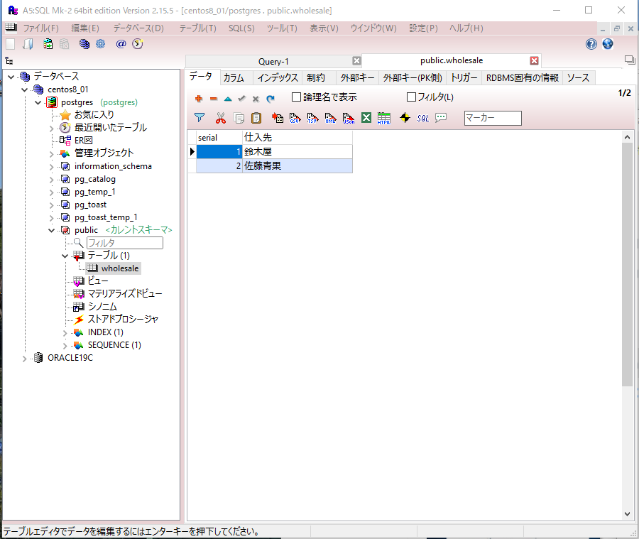 postgres=# INSERT INTO wholesale (仕入先) VALUES ('佐藤青果');