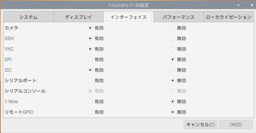 設定画面で、インターフェイスを選び、カメラを有効に変更します。