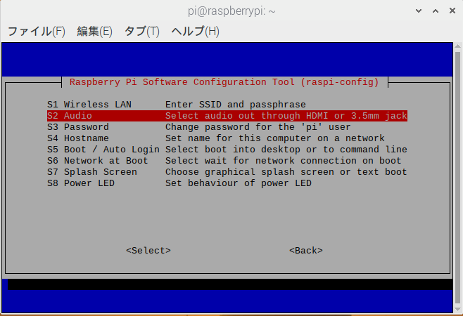表示した raspi-config の画面で、「1 System Options」→「S2 Audio」へ進みます。