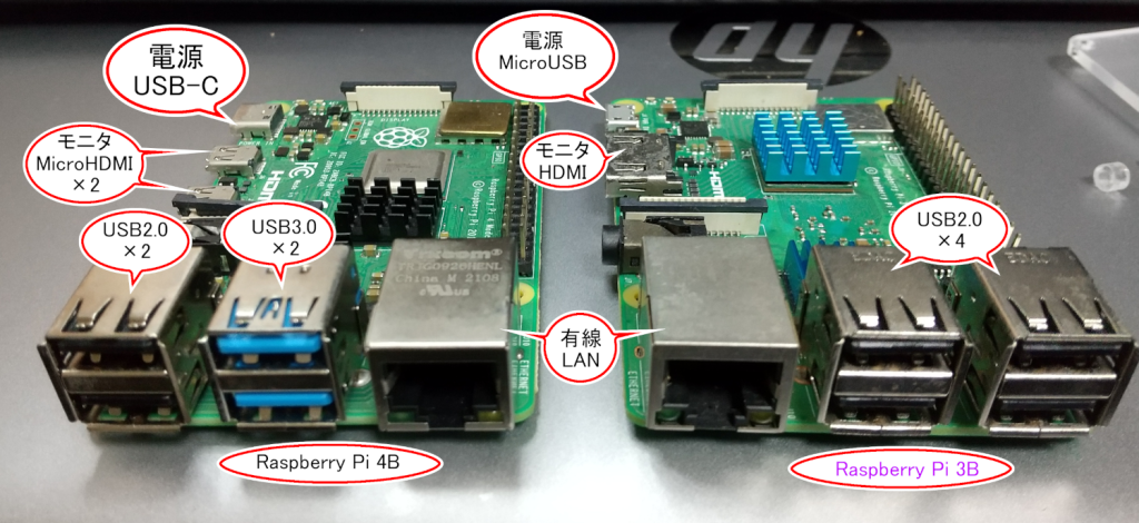 Raspberry Pi 3BはフルサイズのHDMI、Raspberry Pi 4BはMicroHDMIなので、互換性はありません。