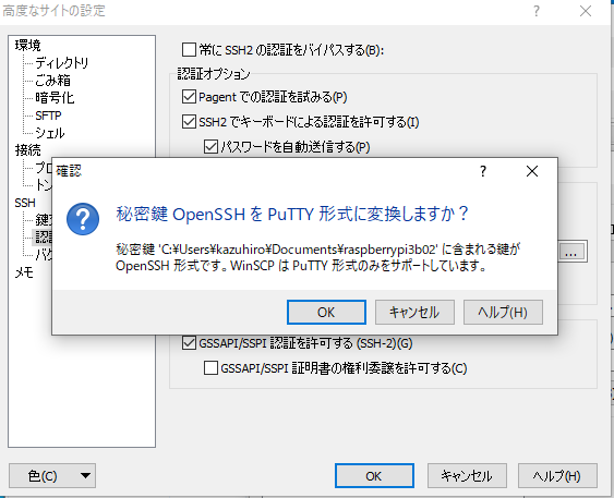 そして、鍵作成 で保存して置いた、拡張子のない秘密鍵の場所を指定します。