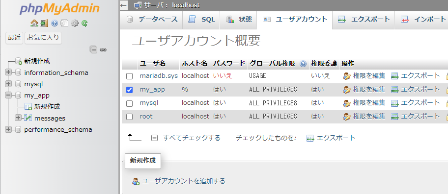 また作成したデータベースの権限からユーザーアカウントを作成しておきます。