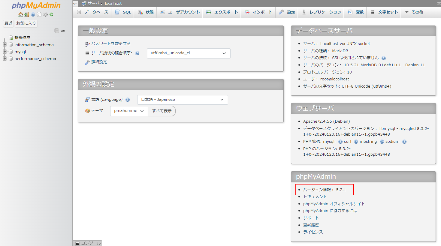 sudo cp -R ./phpmyadmin /usr/shareこれで新版に切り替わったはずなので、起動してみます。