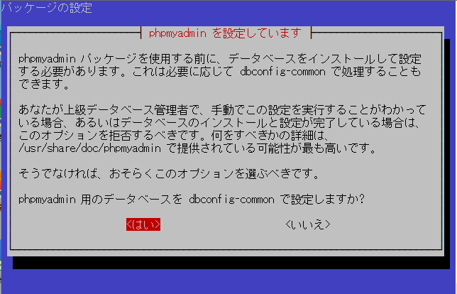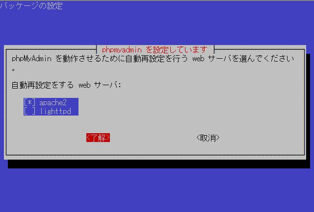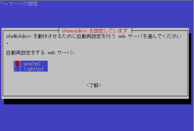 sudo apt install phpmyadmin設定が進行すると、次の画面が現れます。