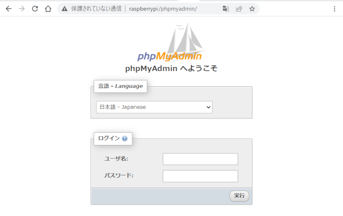 http://[ラズベリーパイのホスト名]/phpmyadmin/で接続すると、このようにphpmyadminの画面が表示されます。