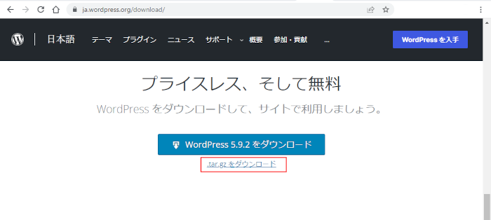 WEBブラウザで接続し、WordPressを入手のボタンを押下すると表示されるダウンロードページで、「tar.gz をダウンロード」の部分のリンクがまさにコマンドのリンクそのままですね。